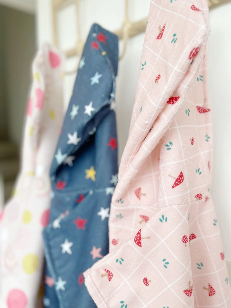 La toalla no es de algodon, por lo cual no seca al 100% ; es mas bien una propuesta de salida de baño. Medidas: tiene un largo de 60 cm + la capuchita y una ancho de 53 cm. Justo abajo de la capucha, tiene una etiqueta para poner el nombre de su dueño/ dueña. Atencion: consultar stock antes de comprar.